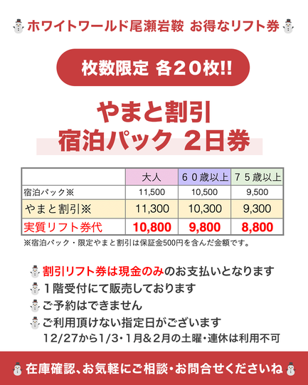 ■尾瀬岩鞍 宿泊パック2日券 限定販売