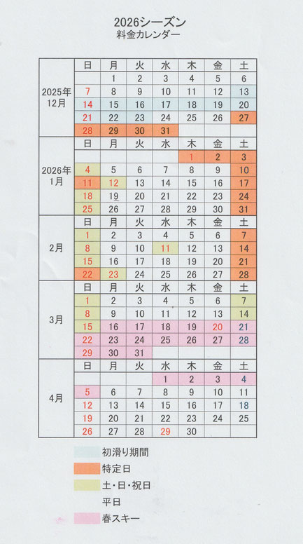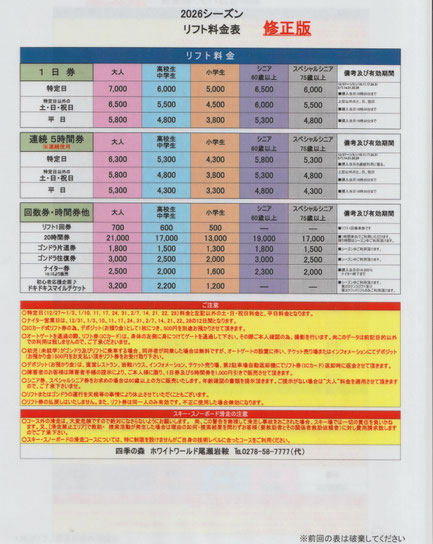 ※片品村内 岩鞍以外の他のスキー場の料金はお問合せください