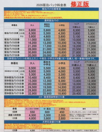※リフト券料金「宿泊パック」は「宿泊割引価格」のみを掲載しており、宿泊代金とは別になります。